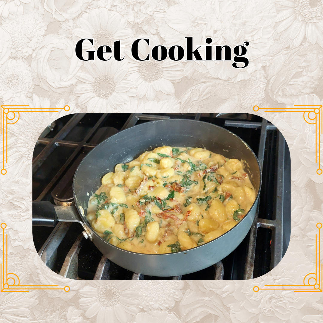 - Next you will add the gnocchi and sun-dried tomatoes, stir everything. Cover your skillet and allow to cook for 5 minutes.