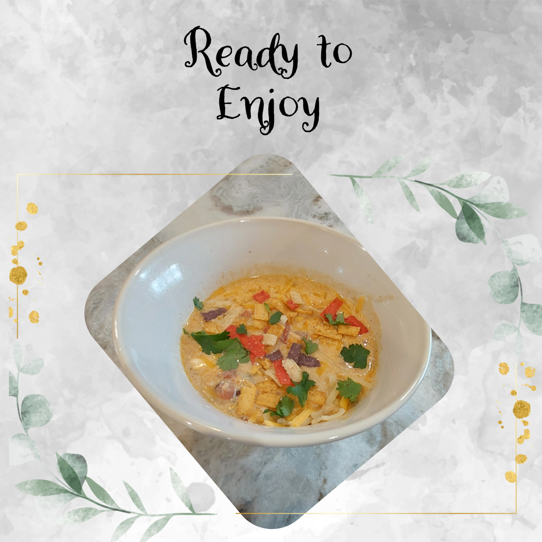 - Serve with garnish of choosing. We use cilantro, onion, more shredded cheese, tortilla strips.
